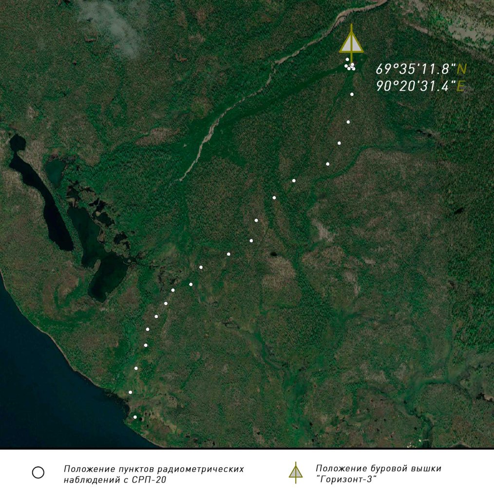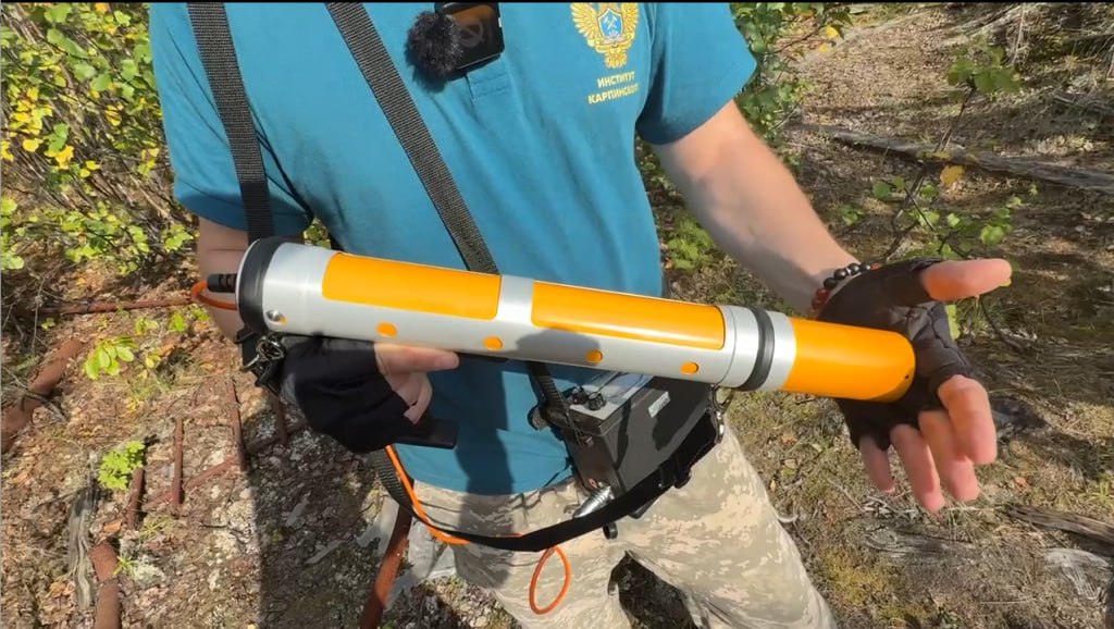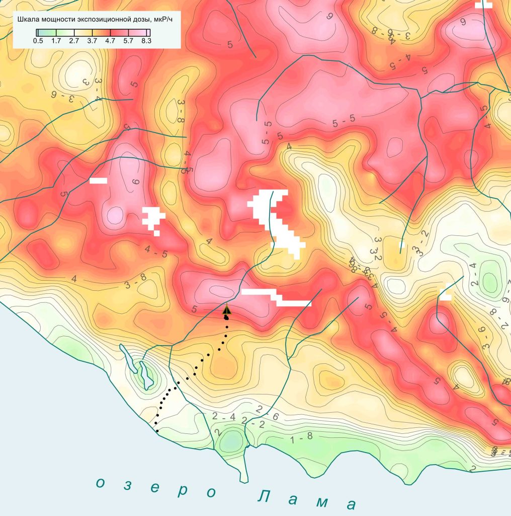 Оценка радиационного фона была выполнена нашими специалистами с помощью радиометра СРП-20 с шагом 50–70 метров по всему маршруту были проведены замеры. Полученные значения в 2,5–5 мкР/ч подтвердили исключительно низкий радиационный фон, соответствующий естественным природным показателям. Также были проведены измерения с помощью гамма-спектрометра МКСП-01 в нескольких точках, включая устье скважины.